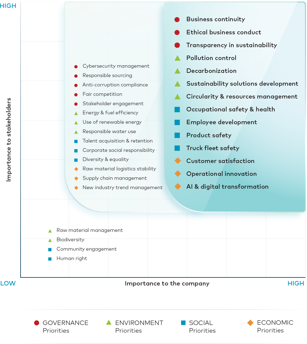 The materiality process identifies and prioritizes issues that are significant to both the Company and our stakeholders. Following the stakeholder engagement process, we have grouped all relevant sustainability items into four categories: Governance, Social, Environment, and Economic. In the chart below, we have highlighted the most significant issues in two levels. This allows us to tailor our future plans and actions to address these key issues effectively. These categories align with our Ambitions 2030 plan.