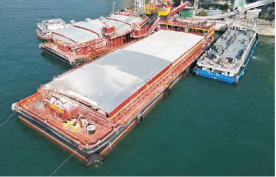 For example, the aggregates replenishment barges from Mainland China are equipped with fully enclosed conveyor belts and discharge chutes to prevent dust emissions during unloading. The aggregates barges stationed at the seafront of our concrete batching plants are fitted with mechanical covers and water sprinklers to prevent dust emissions from stockpiles and during loading and unloading processes. Additional measures, such as bunding the edge of the deck and regularly removing dusty materials from the deck surface, prevent dust emissions and any polluted water from leaking into the sea.