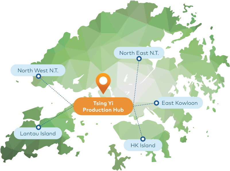 Situated at the heart of Hong Kong, Tsing Yi Island is well-connected by highway networks, allowing us to supply concrete and aggregates to development projects within an hour. We have intentionally designed the Tsing Yi Concrete Production Hub with substantial storage capacity for both cement and aggregates. This capacity allows us to maintain production and supply for two days during severe logistics interruptions, such as approaching typhoons, without needing immediate replenishment.