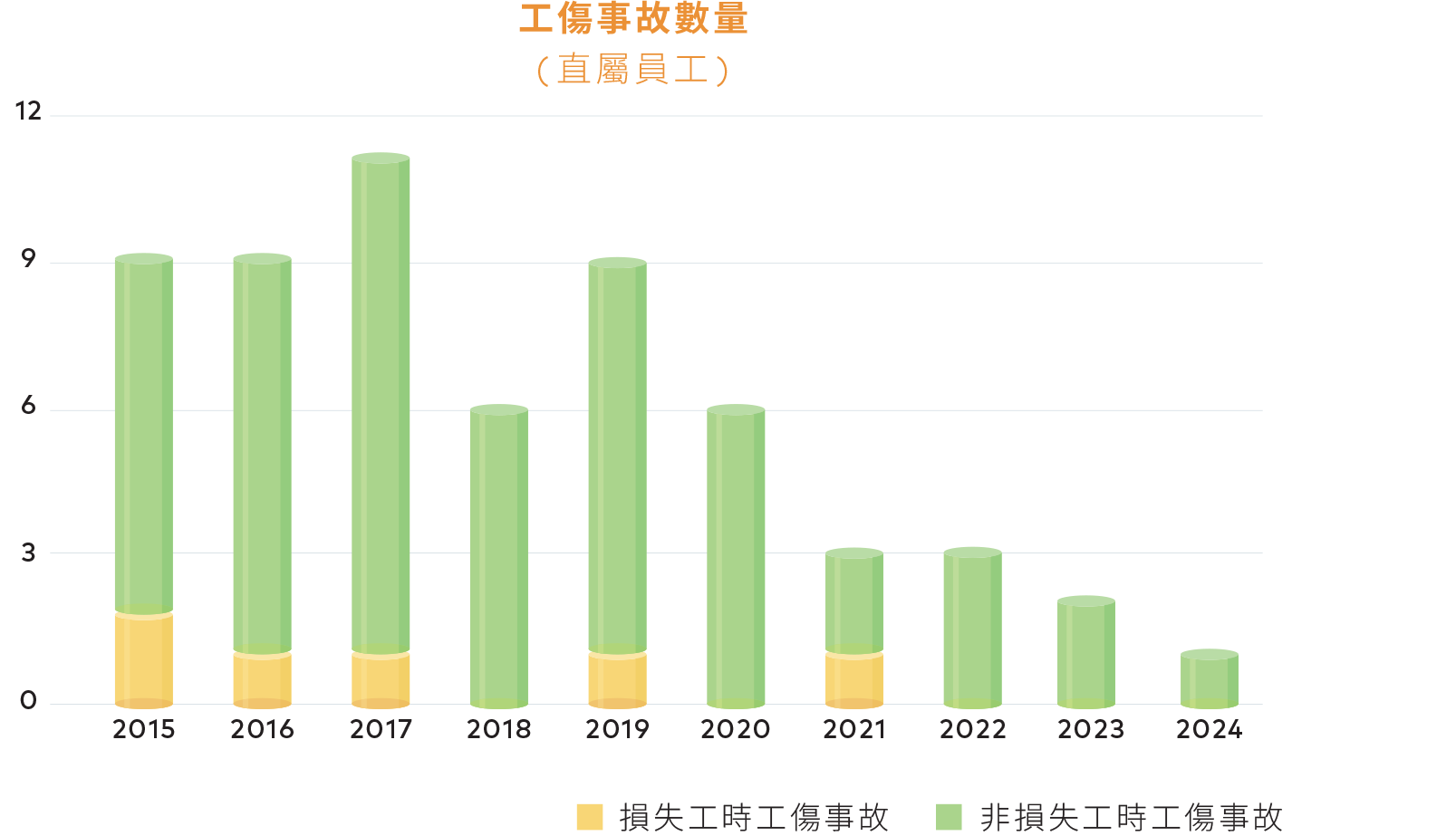 我們通過健康與安全計劃展示了保護每位員工、創造零危害工作場所的決心,這些計劃旨在超越法規合規性。我們提倡「以設計創造安全」,從項目開始就整合了安全考慮,以及「 以科技提升安全」,並使用先進工具進行風險管理。我們還大力鼓勵員工參與,培養一種每個人都積極參與安全改進的文化,從報告健康與安全隱患到出席委員會會議,以至參與工作場所標準改進項目。